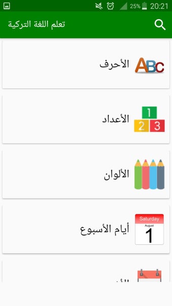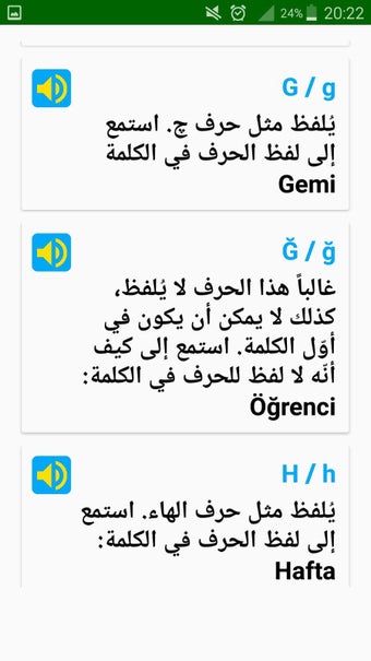 Appen innehåller mycket ordförråd och grammatik. Varje ord och varje mening är uppdelade i en översättning och en ljudversion för att hjälpa dig att öva på att uttala ordet eller meningen korrekt. Översättningen är skriven på arabiska och turkiska.